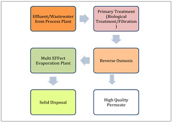 * Pre-treatment and evaporation of the industrial effluent until the dissolved solids precipitate as crystals. These crystals can be used in fertilizer industry or can be used for land filling. The water vapors from evaporation is condensed and returned to the process.
